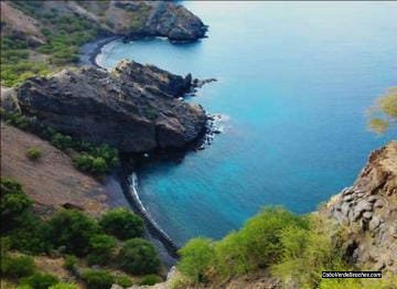 The beach features black volcanic sand—a signature of Santiago Island Beaches—and clear blue Atlantic waters that are typically calm and safe for swimming.
