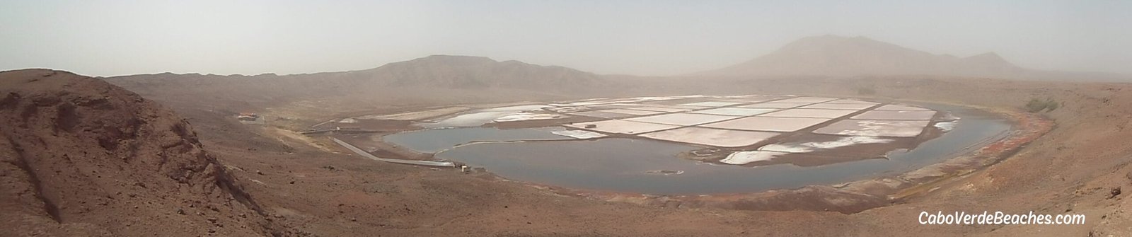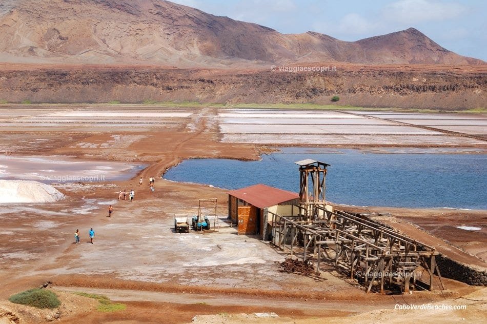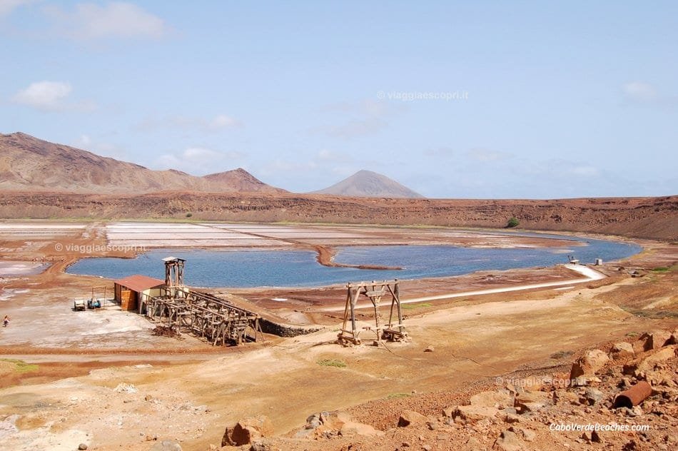 Scenic view of Salina di Pedra de Lume, Sal Island, Cape Verde, showcasing golden sands, crystal-clear waters, and the surrounding volcanic landscape.
